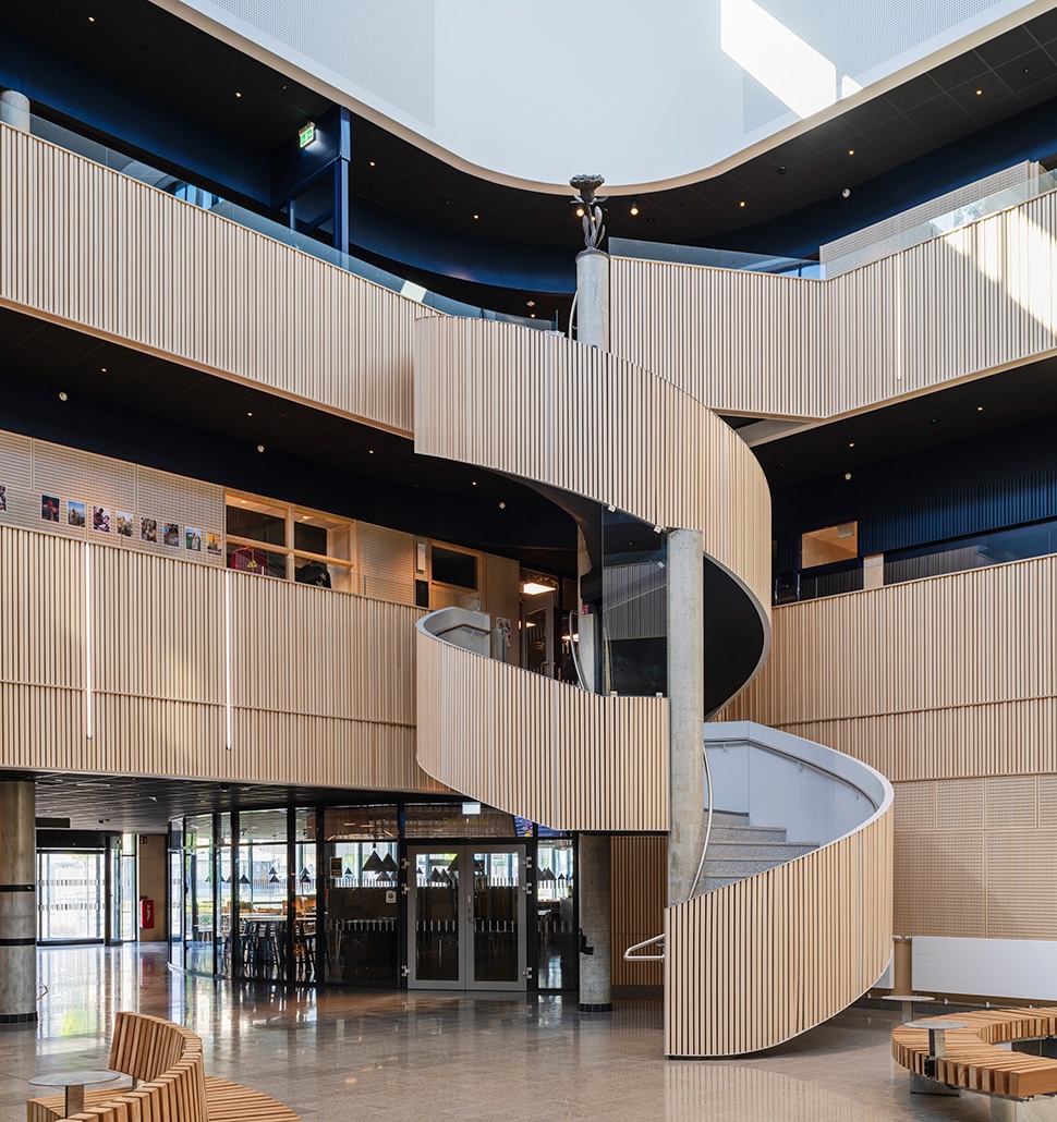Szkoła Lundby Biuro architektoniczne D Office Architects zaprojektowało nową szkołę Lundby na wyspie Hisingen dla miasta Göteborg. Szkoła może pomieścić 630 uczniów klas 7–9, a także uczniów objętych obowiązkową edukacją dla osób z niepełnosprawnością intelektualną. Znajduje się w niej również szkoła kulturalna i hala sportowa, dzięki czemu budynek może funkcjonować jako aktywne centrum społecznościowe również wieczorem. Projekt koncentruje się na bezpieczeństwie, ciepłym klimacie i środowisku, w którym uczniowie mogą się rozwijać zarówno w trakcie zajęć szkolnych, jak i po ich zakończeniu. Wygląd zewnętrzny budynku czerpie inspirację z lokalizacji i częściowo zachowanej dawnej szkoły, wykorzystując czerwoną cegłę i tradycyjne materiały, aby zachować poczucie ciągłości. Jednocześnie architektura wyraża współczesną tożsamość, spełniając nowoczesne potrzeby edukacyjne. Duże przeszklenia nadają szkole otwarty charakter, podkreślając jej działalność i wzmacniając jej więź z otoczeniem. Przy wejściu uczniowie i goście trafiają do jasnego centralnego foyer z kantyną i biblioteką multimedialną po obu stronach, oferującym długie linie widzenia, które tworzą przyjazną atmosferę. Przestrzeń ta stanowi społeczne centrum budynku, uzupełnione kawiarnią i obszernymi miejscami do siedzenia. Na wyższych piętrach znajdują się dodatkowe strefy wypoczynkowe, w których uczniowie mogą się zrelaksować i spotkać między lekcjami. Wewnątrz naturalne materiały, takie jak łupek i drewno, łączą się z powściągliwą paletą ciemniejszych odcieni, tworząc spokojne, harmonijne środowisko, w którym uczniowie mogą czuć się jak w domu. Firma Gustafs wniosła swój wkład w projekt, dostarczając panele akustyczne Linear Ribs, perforowane panele akustyczne oraz gładkie panele drewniane z forniru brzozowego barwionego na biało. Na wyższych piętrach panele Linear Ribs w kolorze głębokiego błękitu dodają kontrastu i tekstury. Architekt: D Office arkitekter Deweloper: Miasto Göteborg Wykonawca: Peab Film i zdjęcia: Devis Bionaz